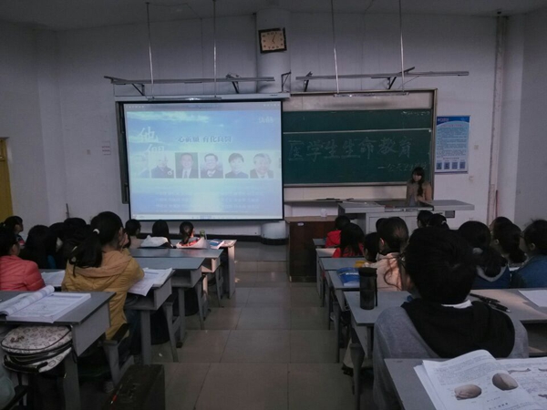 “请上前一步,献花”、“请行合十礼”,在老师的引导下,15级预防医学专业四个班的员工,分别在各自班级的实验室里向解剖学标本“无语良师”献上洁白的小花行追思礼,默哀致敬。