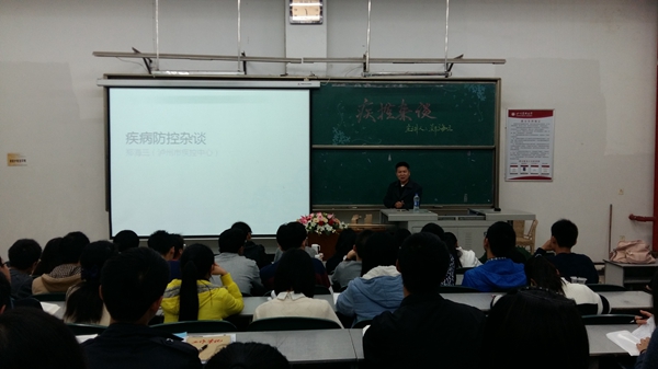 讲座中,郑海三结合自己三十年来在疾控中心工作的经历,为同学们介绍了疾病预防控制中心的概念、疾控中心需要监控的疾病类型以及疾控中心的功能职责。郑海三强调对疾病的预防、监测、预警、预报、干预等都属于疾控中心的范围,特别说明了是疾控中心在控制突发公共卫生事件时发挥的重要作用。在沟通互动环节,同学们纷纷就本专业就业前景、是否应该考研等问题与郑主任进行了探讨。