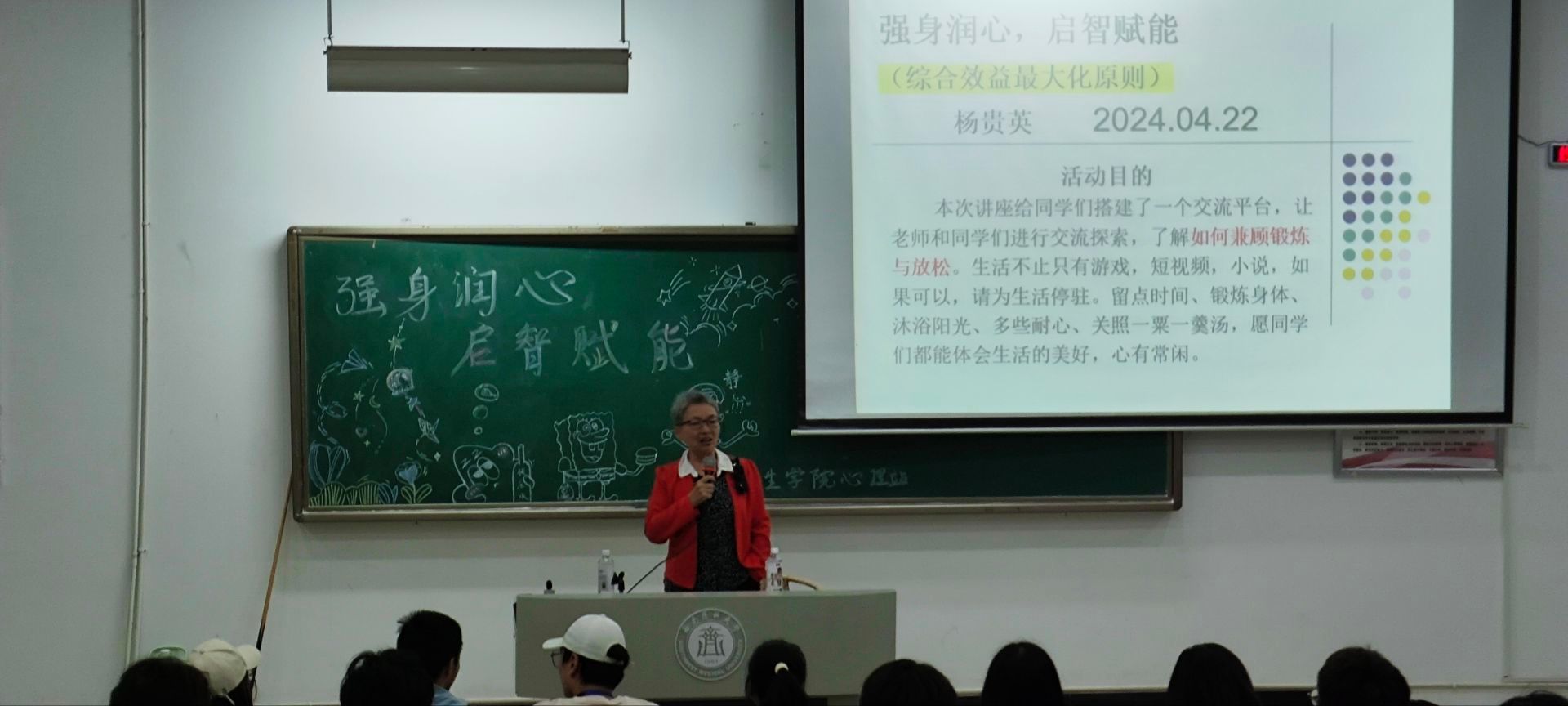 为让同学们更好的将学习、锻炼、放松三者完美的结合在一起。bevictor伟德官网于4月22日在海川楼514教室开展“强身润心,启智赋能”主题心理讲座。此次讲座由杨贵英老师来担任主讲人,bevictor伟德官网的110名同学参与本次讲座。