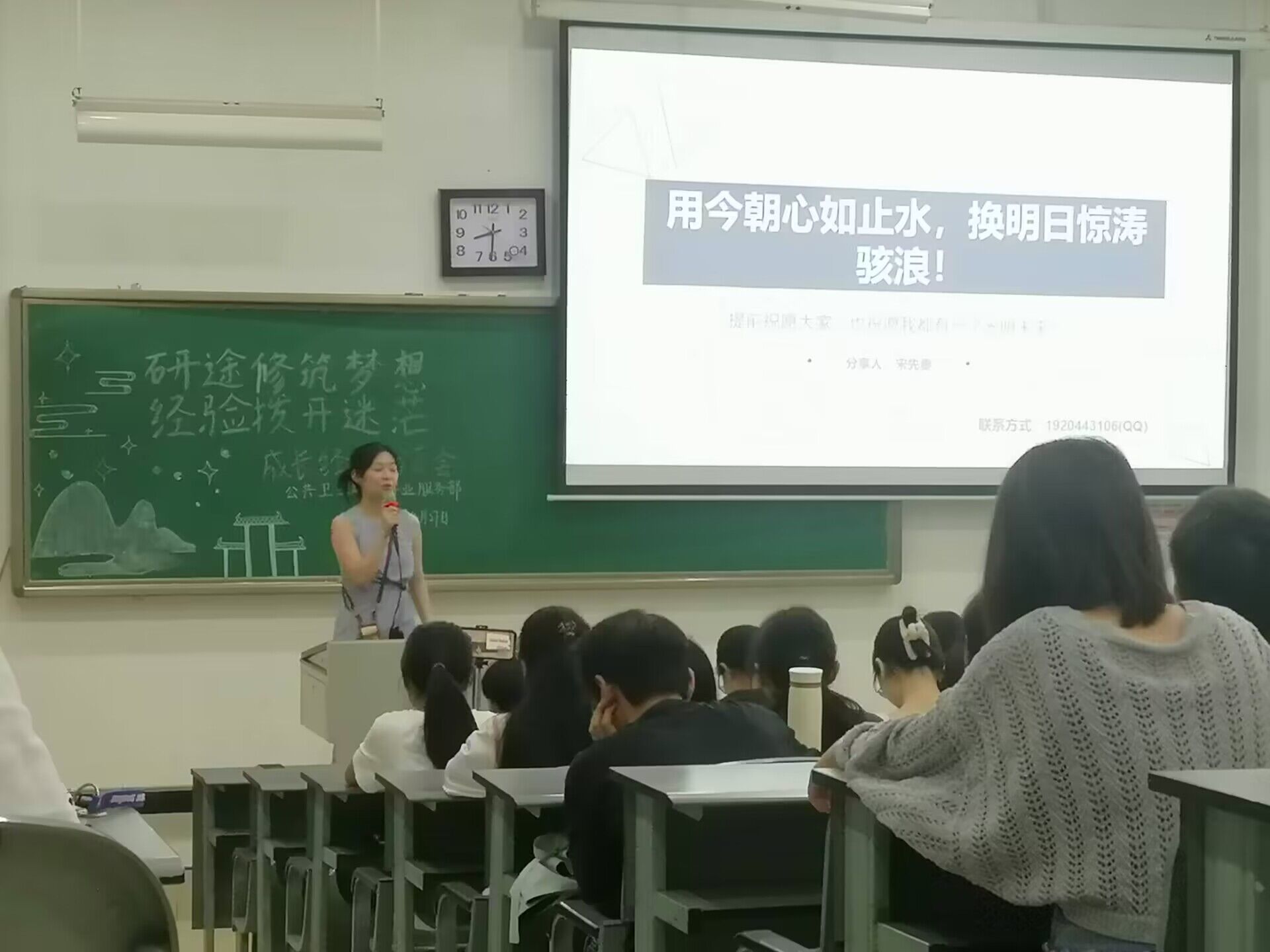 分享会开始,张渠城学长主要从学习方法、重要时间节点以及考研的心路历程三个方面分享;林磊学长从职业规划入手,总结自己的备考过程和经验,同时也分享了自己的学习工具;宋先秦学姐则是从科研讲起,又谈到志愿实践并讲述了自己的保研之路以及保研相关的一些问题。最后,袁子璐老师对本次活动进行总结。