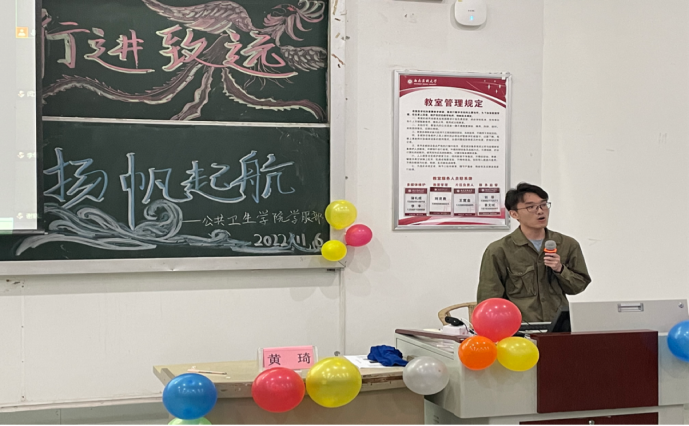 接着是在清华读博士的黄琦学长与大家互动,针对同学们提出的问题,为大家总结出以下建议:在大一可以想想你要做什么,有什么想法。多听多看,有想法就要勇于尝试。学长也对于公卫特点总结了三个方面研究方向,动物实验、人群调查问卷、政策审计方面。毕竟数据分析可是公卫的优势。如何找不断的问自己我想做什么,兴趣是最好的老师。当然最重要的是要打好基础,要好好学习,成绩是立身之本。最后,来自临床医学大一的蒋校煊同学团队介绍了组建队伍参加细胞生物学创新课堂大赛的经历,在这个过程中他们有情绪低迷,有暴躁,但他们都相辅相持,获得了优异的成绩。最后是员工科老师孙老师为大家总结陈词,提出新生们要积极向上,充满朝气,懂礼貌。
