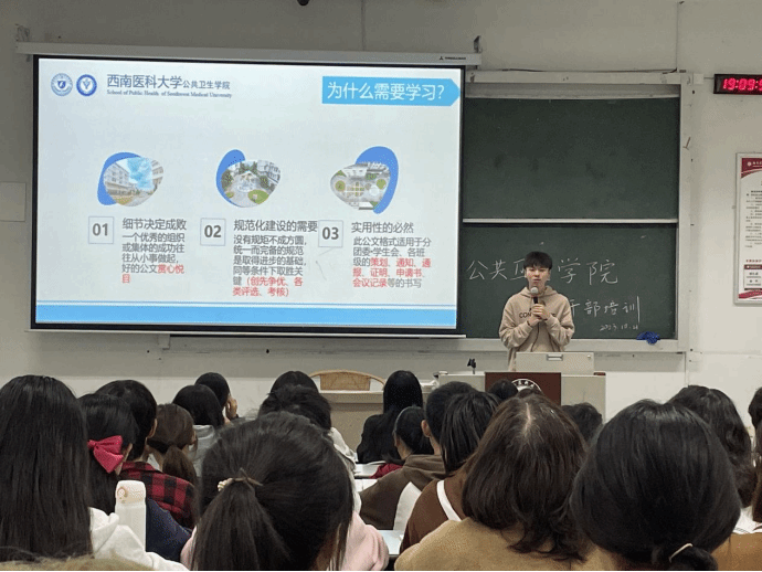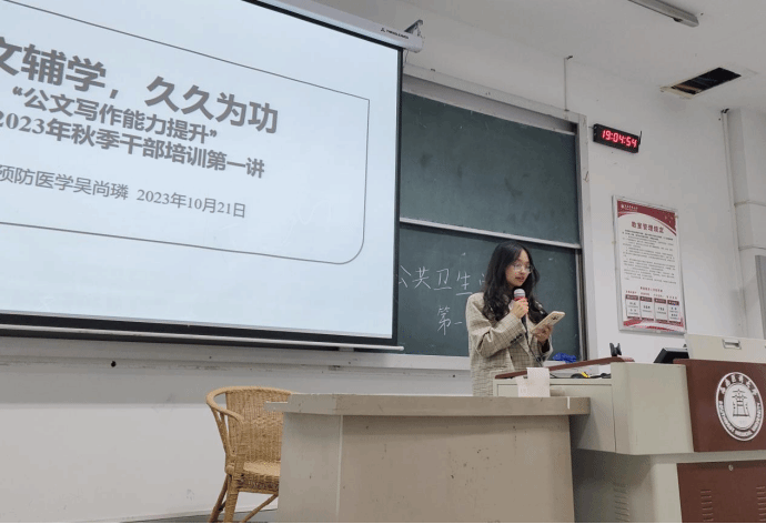 首先,吴尚璘主席介绍了本次活动的主题,提出了问题:“为什么要学习公文写作?”,并列举实例让同学们认识到了公文写作规范的重要性。随后便从公文定义和规范出发,详细讲解了公文的特点、形式和使用场景,并分享了一些公文写作的技巧和注意事项。此外,他还对新闻稿和通知的写作方法和技巧进行了简单介绍。