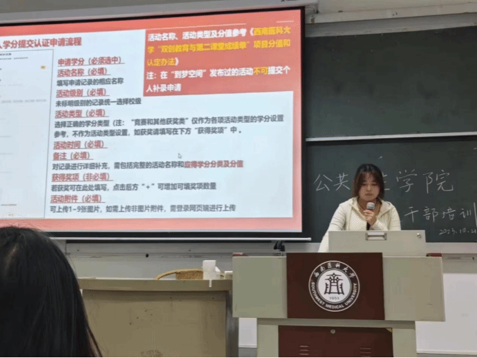 随后,组织部部长刘婉玥为大家讲解了第二课堂的运行方式,以及怎样才能申请发布活动、发布活动的注意事项,对于第二课堂学分和诚信分也进行了讲解。除此之外,还回答了部分在参与第二课堂过程可能遇到的问题。通过讲解精心准备的演示文稿,让大家具体的了解到了第二课堂的相关内容。