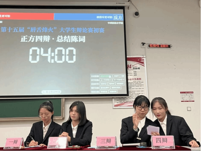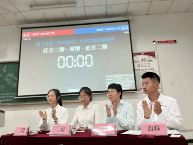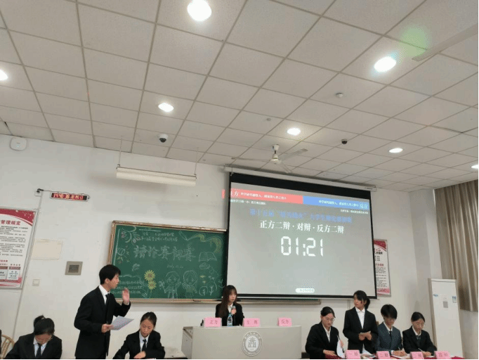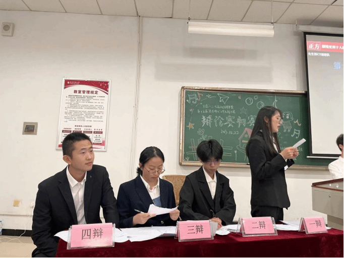 与此同时的414教室,则是医学影像系辩论队与基础22级一办辩论队带来的开场比赛。双方以“逆境和顺境哪个更利于人的成长”为辩题展开辩论,正方一辩对己方“顺境更有利于成长”的观点开篇定论,反方一辩不下风头,采用各种广泛的资料用己方‘逆境更有利于成长’的观点反驳正方。辩论赛的氛围持续高涨,愈演愈烈,正方多次强调顺境有利于提供更好的物质和精神条件,实现自我价值。反方则说明困境能够磨砺完善人格,引用了毛泽东主席 “温室里的花朵永远经受不了野外的暴风雪”的话语。在辩论赛最后,来自医学影像系的正方辩论队平均分78.25分,来自基础22级一办的反方辩论队平均分76.75分,正方辩手获得此次辩论赛初赛胜利。