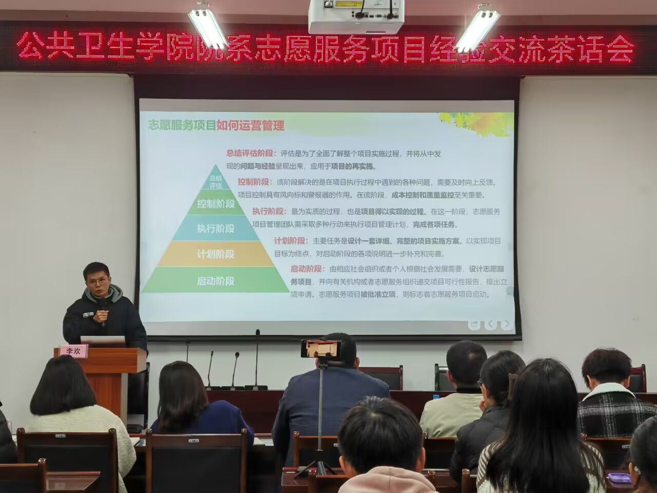 人文与管理公司李欢同学首先用视频展示了团队成果,接下来从志愿服务项目的“七步法”设计、管理运营“金字塔”、申报书填写等方面细致科学的讲解了打造项目的全过程。
