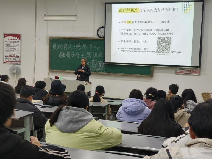 首先,杨贵英老师以一个问题为展开:“我们要感谁的恩”?接着,杨贵英老师通过对一个乡村女孩读书的故事的阐述回答了这个问题,“那就是我们要感恩,感社会的恩,感国家的恩”。资助政策帮助无数学子解决了经济问题,让同学没有后顾之忧,为每一位学子的成才之路保驾护航。其次,杨老师提到了我们青年一代独有的优势,就是“我们随时可以安宁地使自己微笑”,我们不会过多在意自身物质条件,而是用学习来充实我们的大脑。接着,杨老师讲到了他人在对我们表达爱,表达善意的时候我们要学会适当接受,这样他人也能接受我们的爱和善意。最后,杨老师谈到了感恩的目的和重要性。感人之恩,必与人为善。一个知恩感恩的人,他的生活环境必定是完美的,使他幸福平安的。