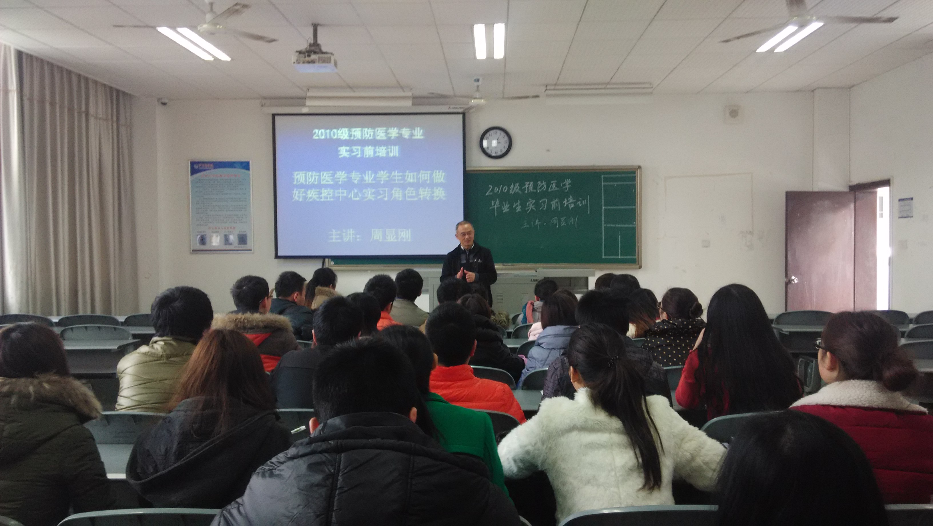 为了更好地帮助即将进入疾控中心实习的预防医学专业员工更快地融入实习生活,及时了解专业实习要求,bevictor伟德官网于12月25日下午在海川楼召集2010级预防医学专业员工进行首次实习前培训,此次培训的主题为“预防医学员工如何做好疾控中心实习角色转换”,邀请到泸州市疾控中心周显刚教授主讲。