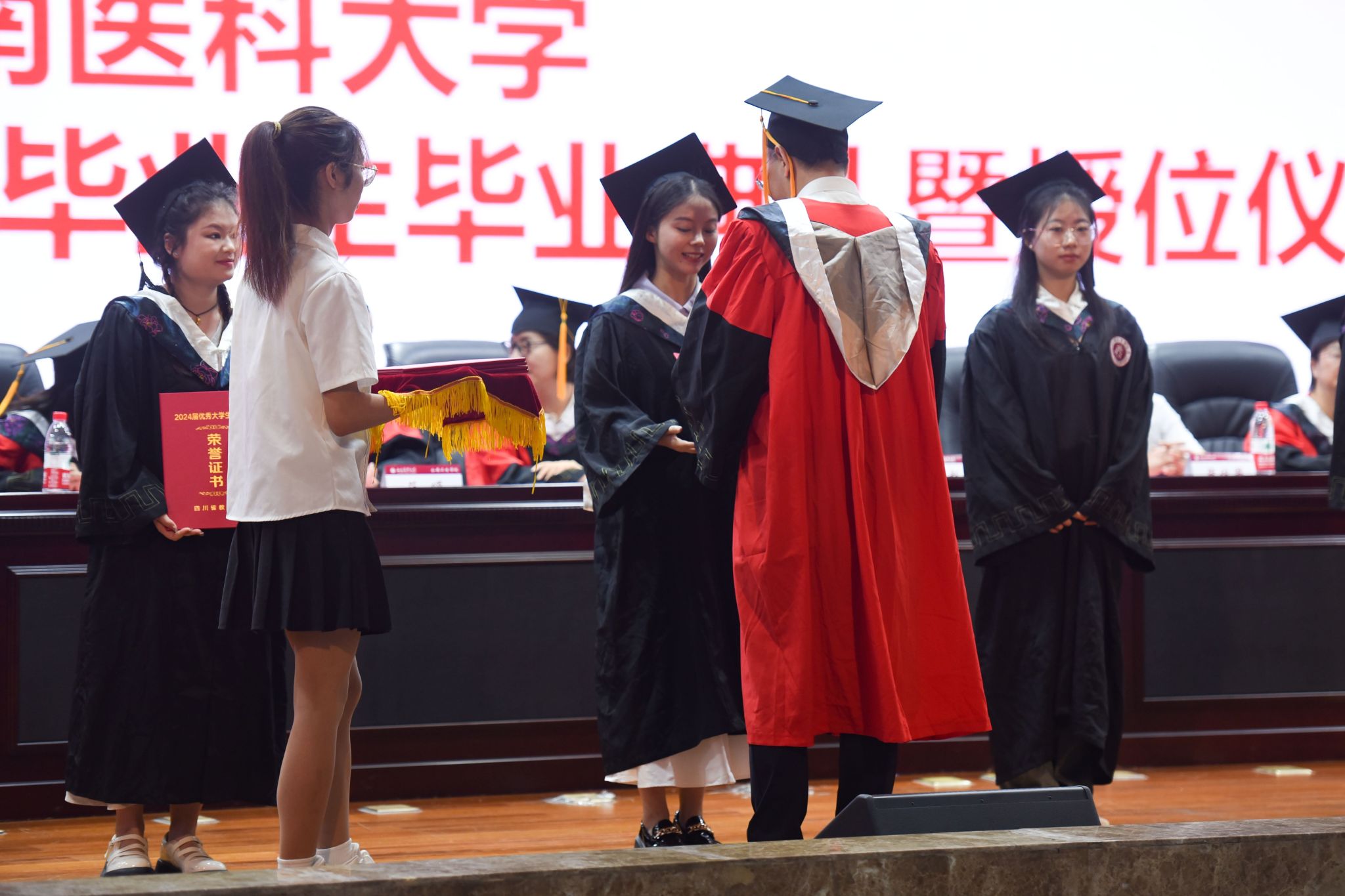 随后,授位仪式正式开始。在庄重的音乐声中,赵董事长和bevictor伟德官网学位评定委员会全体委员为每一位毕业生颁发毕业证书和学位证书,并拨正学位流苏。这一刻,全场师生共同见证了毕业生们的高光时刻,也感受到了他们内心的激动和自豪。