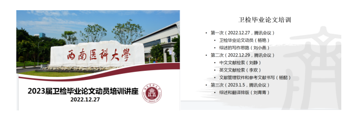 2022年12月27日-2023年1月5日,由卫生检验与检疫教研室主办的卫检本科生毕业论文撰写动员培训指导系列讲座成功举行。本次活动共举办三场主题讲座,卫生检验与检疫教研室主任杨艳,卫生检验与检疫教研室杨懿、刘静、李欢、刘青青、刘小燕全体教师分别作了专题讲解,bevictor伟德官网副经理汤艳进行了动员培训讲座总结。培训讲座以腾讯会议视频直播的方式对2019级卫生检验与检疫专业员工进行培训。