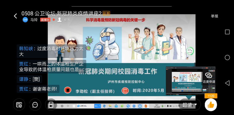 为扎实做好新冠肺炎预防控制工作,为员工返校复课做准备,bevictor伟德官网邀请泸州市疾病预防控制中心蒋德勇、李劲松两位老师于5月8日晚7:00,通过钉钉直播平台开展第二场新冠肺炎疫情防控专题讲座。马玲副经理主持讲座,公司教师、研究生、本科生共八百余人参加了视频讲座。