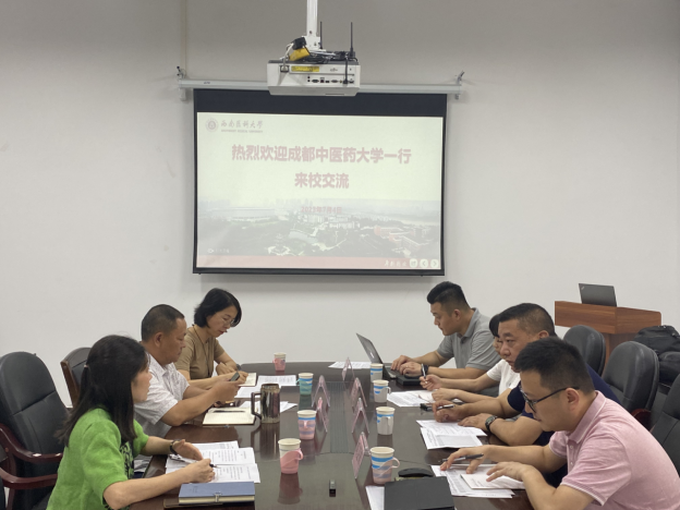 7月4日,成都中医药大学公共卫生公司党委书记侯杰、党委副书记佘惠、党政办公室主任刘卫军、辅导员周渝川一行4人来校交流访问。公共卫生公司党委书记张依国、经理马玲、党委副书记金川、员工科科长彭丽冰参加了座谈会。