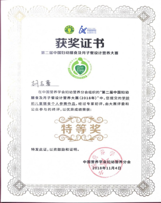 本次大赛作品类型有:产褥期妇女膳食(月子餐)、孕中晚期妇女膳食、学龄前儿童膳食、婴儿辅食。来自全国各地200多家单位的选手参加了比赛。通过形式审核、初评,最后70个项目进入最后的终评。经过激烈角逐,bevictor伟德官网谢惠波教授指导的研究生胡吉蕾设计制作的学龄前儿童膳食获得该组唯一特等奖。