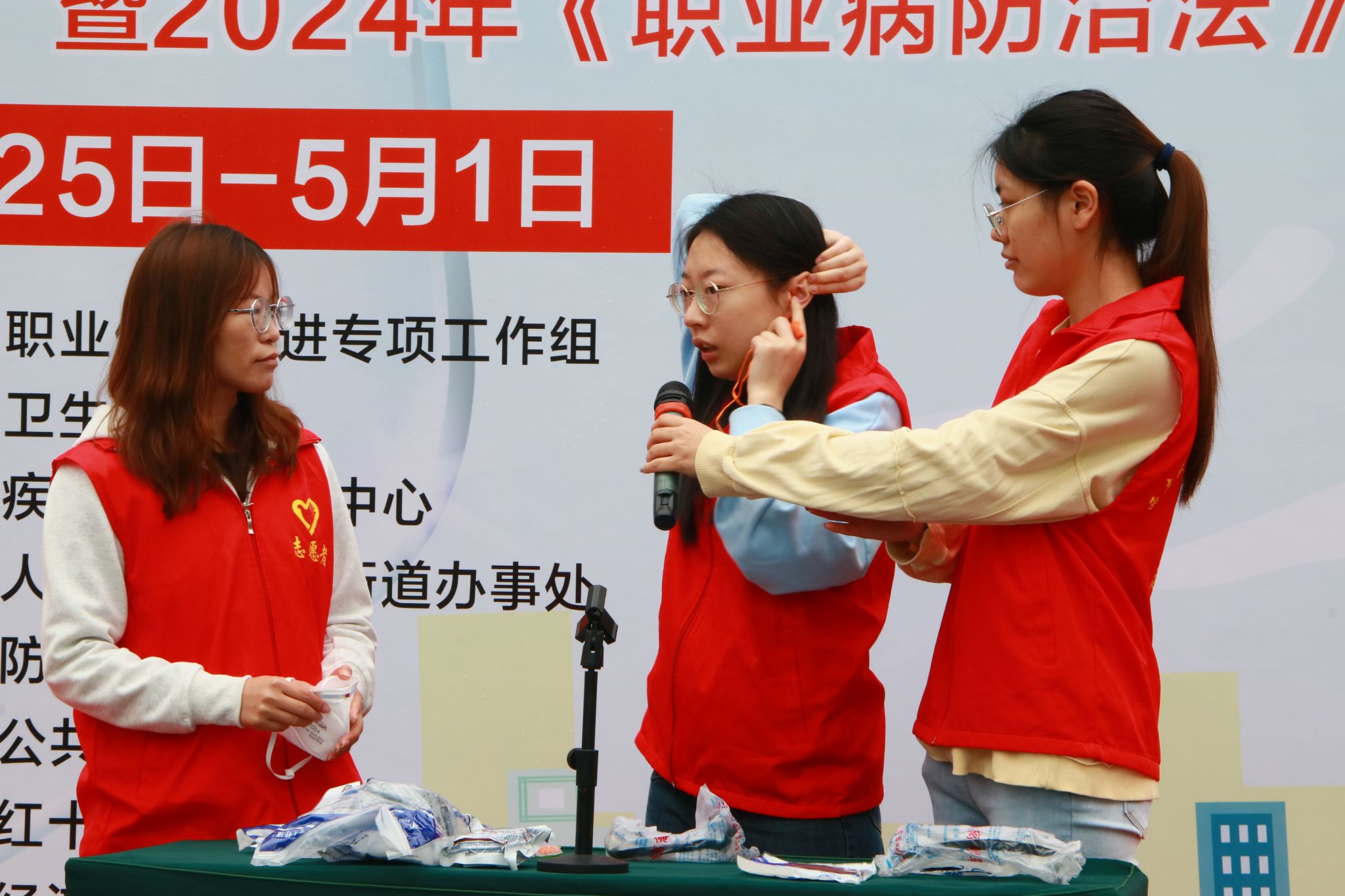 活动现场通过自行设计宣传展板、发放宣传资料、开展现场咨询等活动,向群众普及职业病防治知识。研究生们现场为企业主要负责人、职业健康管理人员和一般劳动者讲解职业健康防护知识、演示个人劳动防护用品的正确使用方法,并发放宣传手册、口罩和耳塞等防护用品。最后希望用人单位切实落实职业病防治的主体责任,增强劳动者职业健康自我保护意识,促进劳动者身心健康。