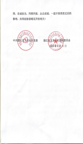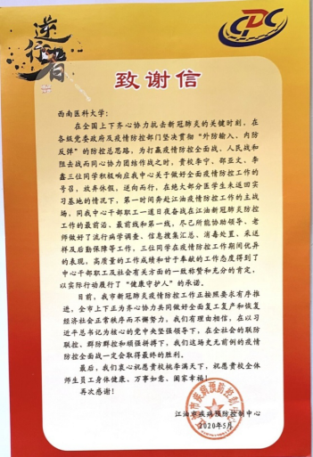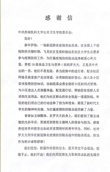 近日,江油市疾病预防控制中心、蒲江县飞龙社区居民委员会向公司发来表扬信,对公司2015级预防医学专业李宁、邵亚文、李鑫以及2019级食品卫生与营养学专业罗天天,四位同学积极响应号召,放弃休假,逆流而行,全力战“疫”的行为予以高度评价。