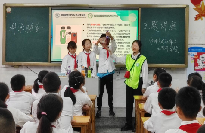 第二部分,志愿者们来到五年级十一班进行合理选择零食互动讲座,科普内容为少吃高盐、高糖、高脂的零食,多吃蛋白质、维生素含量丰富的零食,如:坚果,牛奶,水果等。志愿者利用有趣味的饮料色素实验和员工们互动,向员工们讲解含糖饮料的危害,同学们积极参与,使得科普活动顺利且有成效的完成。