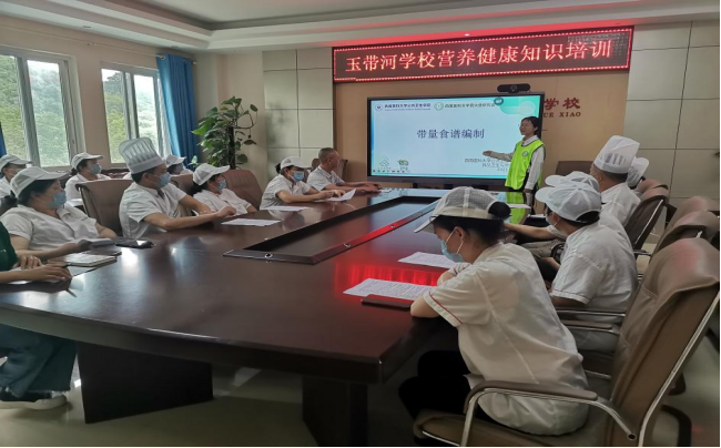 第三部分,志愿者们来到了食堂旁的会议厅利用通俗易懂的四川话对玉带河公司食堂的员工们进行了营养健康知识培训,包括带量食谱的编制:如何确定总能量,克数,配餐原则,菜品营养标签的制作,职工们都积极参与,认真学习,都想为员工们搭配出更加科学营养的饭菜出一份力。