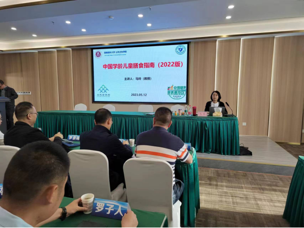 活动当天,马玲教授首先介绍了2023年全民营养周主题“合理膳食 食养是良医”,并对参会人员进行了膳食质量在线测评,强调开展营养健康教育对于儿童青少年健康成长的重要性,针对中国儿童存在的主要健康问题及影响因素进行了分析,并对《中国学龄儿童膳食指南(2022版)》进行了详细的解读,通过现场互动引导大家加强对食品标签的认识和运用,最后结合膳食指南,对营养健康食堂和营养健康公司的建设指南进行了推介。