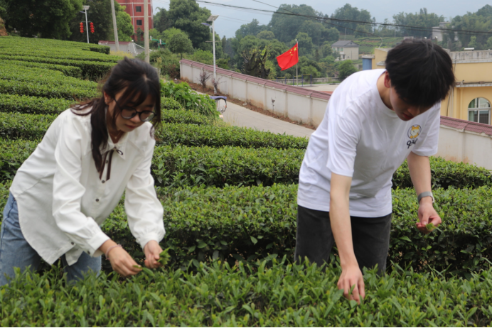 首先,调研小组一行在红岩村党支部书记韦思华和党支部副书记韦勇的带领下,参观了红岩村茶叶种植基地。红岩村是四川省乡村振兴示范村、四川省5A先进党组织,近年来,打造“稻香茶韵·人文红岩”特色品牌,壮大集体经济,助推强村富民。随后,调研小组同学对韦思华书记进行了采访,韦思华书记是四川省2022年度乡村振兴“担当作为好书记”,韦书记在采访中为我们介绍了红岩村的产业发展情况与党建引领情况,韦书记表示,作为一名退伍军人更作为一名党员干部,在乡村振兴这条新的长征路上,将继续肩负起爱民为民助民的使命责任,续写农业农村发展新篇章。调研小组还走访了村民,体验了茶叶采摘。