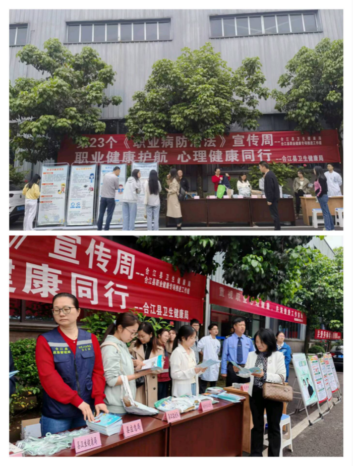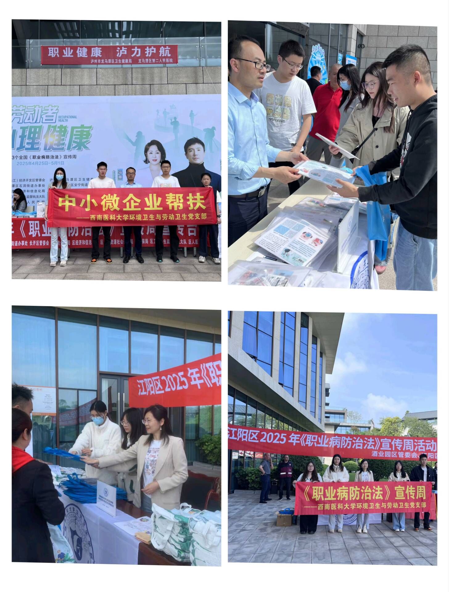 聚焦职业健康,守护劳动安全。2025年4月25-27日,泸州市江阳区、龙马潭区、合江县、泸县四地开展泸州市第2个职业健康集中宣传月暨国家第23个职业病防治法宣传周活动。bevictor伟德官网环境卫生与劳动卫生党支部联合四地的卫生行政部门,以“职业健康,泸力护航”为主题,通过“宣,讲,帮,促”多维度形式,发挥自身专业特长,向劳动者普及职业病防治知识,强化用人单位责任意识。