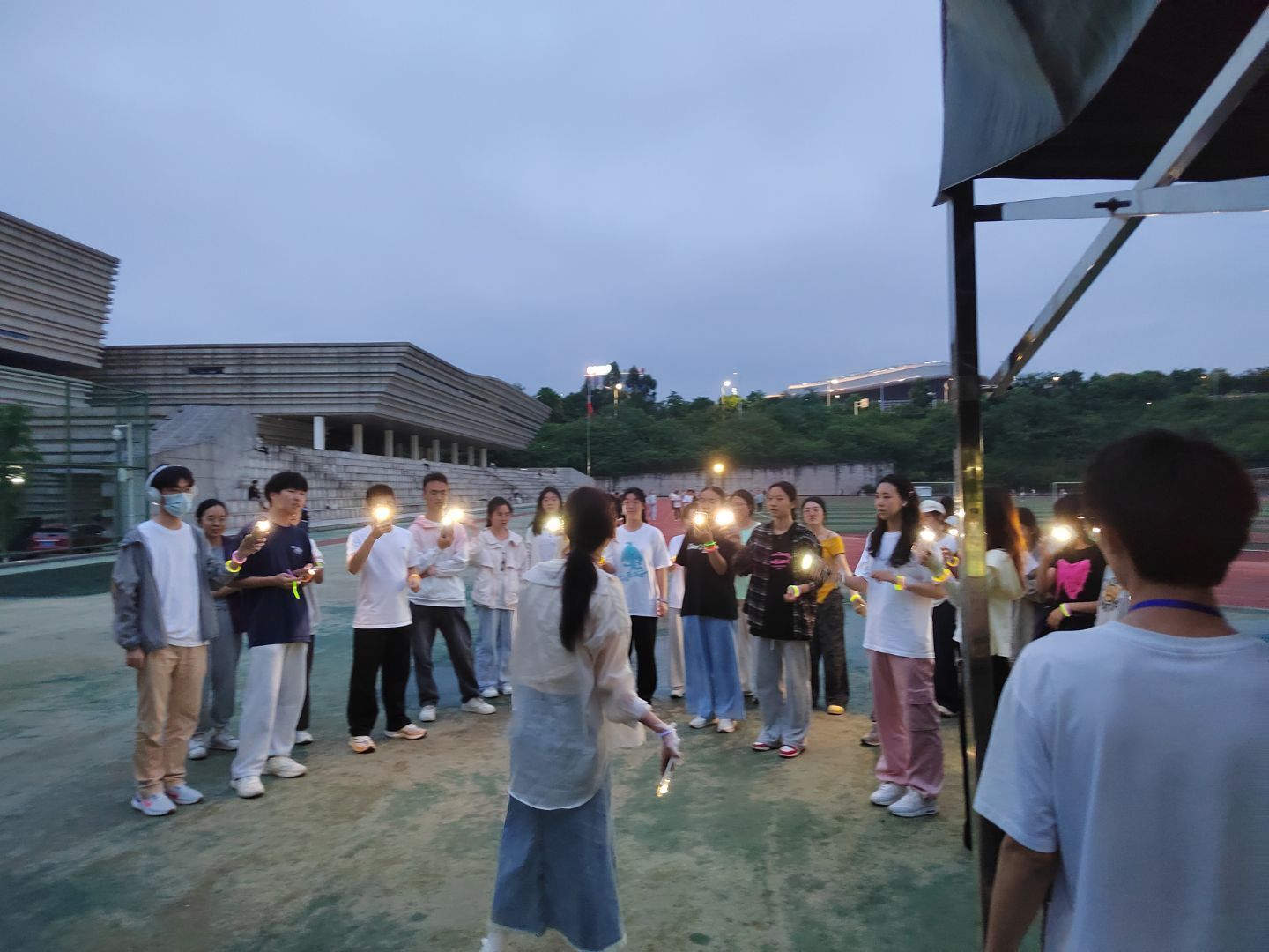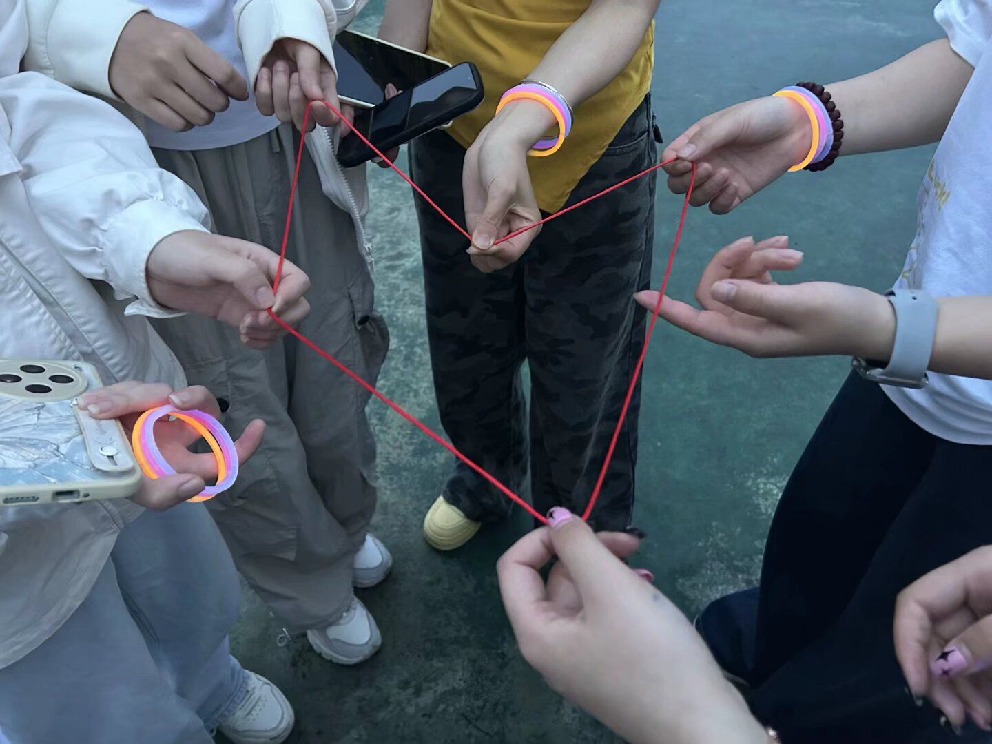 首先,参与者迅速自由组合成5-6人的小队。各小队成员在 “GIVE FIVE”任务卡上印下自己的手印,同时,写下激励目标,为此次夜跑之旅注入奋进动力。其次进行了击掌传递,赞美传递,绳结解心结三个小游戏。随后,全体成员共同合唱歌曲《微微》,歌声悠扬且充满力量。最后,大家高举荧光手环,在璀璨光影中合影留念,为此次活动画上圆满句号。