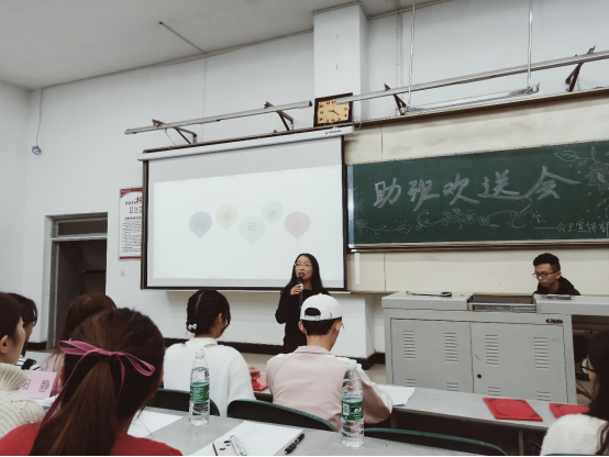 最后由阳书记为本次欢送会做总结。她对2017级助班工作给予了充分的肯定和表扬,并且希望2018级助班能以学长学姐们为榜样,做好老师的助手,当好老师和同学们之间的桥梁,帮助2018级同学尽快适应老员工活,将“助班”这份温暖传递下去。