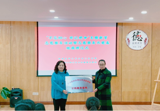 揭牌仪式上,分水岭镇党委书记、纪委书记周建容致辞;bevictor伟德官网经理贾红与分水岭镇董允坝村支部书记黄帮群为志愿服务共建基地揭牌;公共卫生公司党总支书记阳静做总结讲话,她说,bevictor伟德官网师生将秉承“奉献 友爱 互助 进步”的志愿精神,用专业知识服务地方、服务老百姓,共创“健康中国”。