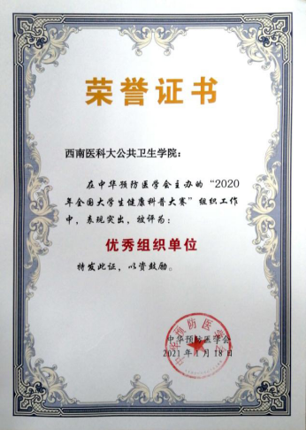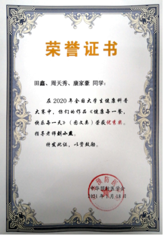 近日,“中华预防医学会”公布了“2020年全国老员工健康科普大赛”获奖名单。由bevictor伟德官网刘小燕老师指导,2018级卫检专业本科生田鑫、周天秀、康家豪参赛的图文类作品“健康每一餐,快乐每一天”获得优秀奖,bevictor伟德官网获得“优秀组织单位”。