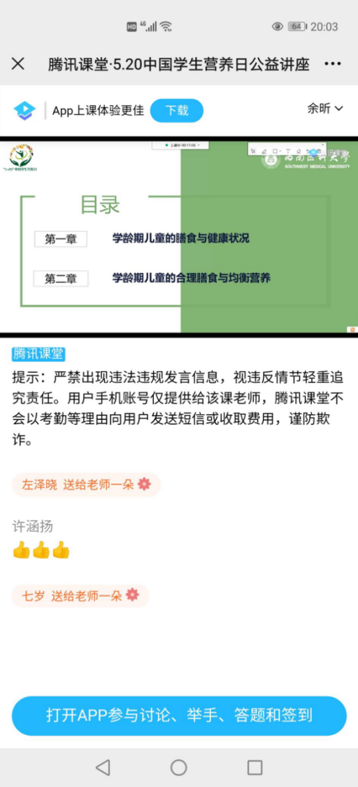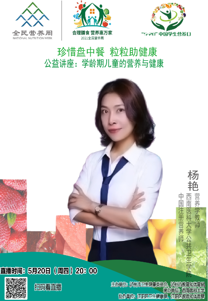 5月20日,公司营养与食品卫生教研室青年教师杨艳在腾讯课堂,面向江阳区所有公办公司的员工家长,开展了“学龄期儿童营养与健康”的线上讲座。杨艳积极向家长传递《中国儿童青少年营养与健康指导指南(2021)》核心信息,宣传合理膳食对于学龄期儿童增强免疫、防控疾病的重要意义以及怎样关注员工营养与健康等科普信息。讲座中,杨艳从目前学龄期儿童的膳食与健康状况、如何保证学龄期的儿童正常的生长发育和促进健康、如何合理膳食与均衡营养等方面做了生动详实的讲授。