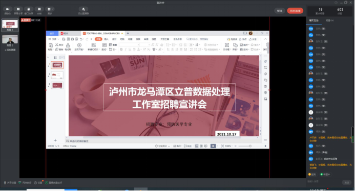 为促进公司员工积极就业,bevictor伟德官网员工科积极与员工联系,2021年12月1日下午,泸州市龙马潭区立普数据处理工作室创世人、公司2014级优秀员工甘雪辉,通过钉钉举办专场招聘会,2017级预防医学专业17名同学参加了招聘会。