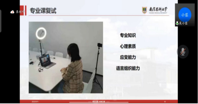 培训会上,吴小蓉等四位嘉宾结合自己的经验,主要从如何制定考研复试计划、如何与导师的交流、考研复试必备网站、考研复试专业课、英语、综合面试的准备等相关内容进行了详细讲解。何金芮从考研调剂准备、调剂渠道、调剂方式、调剂流程及注意事项等几个方面给同学进行详细讲解。最后提问环节,几位嘉宾对同学的提出的问题进行了一对一的解答说明。