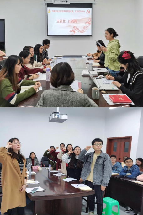 会议开始,2名待转正预备党员从政治思想、学习生活、党性剖析等几个方面进行了汇报,经全体到会党员投票表决,一致同意两人转为正式党员。随后,6名发展对象从入党动机、个人志向、自我认识、未来发展规划等几个方面进行思想汇报,支部书记进行了材料审核情况通报,经全体到会党员投票表决,一致同意吸收6名同志为预备党员。6名预备党员高举右拳,庄严宣读了入党誓词。马玲对6名新预备党员表示祝贺并提出期望,要求所有党员在工作和学习中时时刻刻牢记自己共产党员的身份,以更高的标准要求自己,加强自身建设,通过多方面途径学习党史。