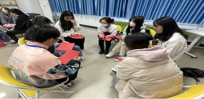 活动一开始,冯老师组织同学们一起玩“大树松鼠”的暖场游戏,这个游戏考验着同学们的反应能力,也增进了彼此的了解。紧接着,同学们根据自己领到的卡纸颜色分组,并在卡纸上写下自己的信息进行组内分享,进一步消除大家的生疏感。
