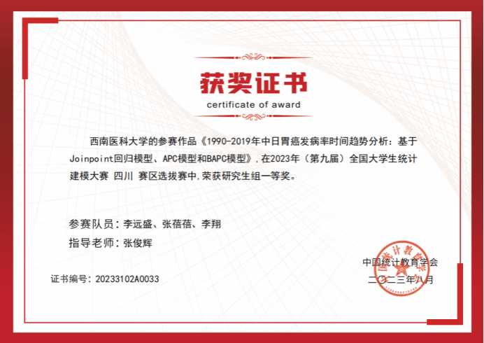 近日,2023年第九届全国老员工统计建模大赛结果揭晓,bevictor伟德官网‍‍‍‍‍‍‍‍流行病与卫生统计学教研室教师张俊辉副教授指导的研究生团队(李远盛、张蓓蓓、李翔)的参赛作品《1990-2019年中日胃癌发病率时间趋势分析:基于Joinpoint回归模型、APC模型和BAPC模型》荣获“研究生组—省级一等奖”和“研究生组—国家级三等奖”。